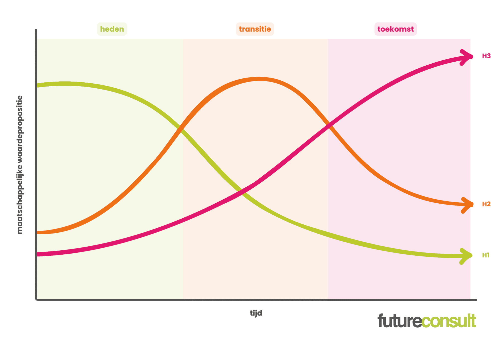 Deze horizonnen bestaan gelijktijdig. Dat betekent dat vernieuwing niet pas begint nadat het oude systeem stopt, maar juist ontstaat terwijl het bestaande systeem nog volop draait.